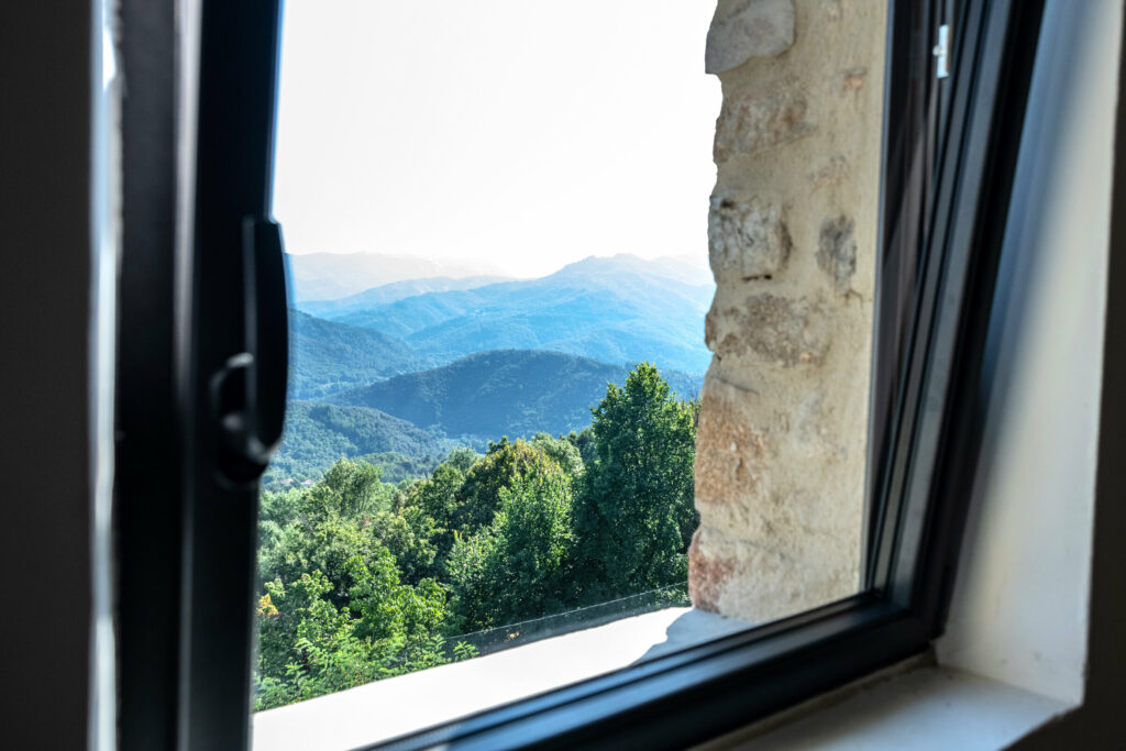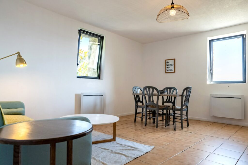 La pièce de vie (salon salle à manger) a une double exposition Est et Sud, avec une vue imprenable sur les monts d’Ardèche.