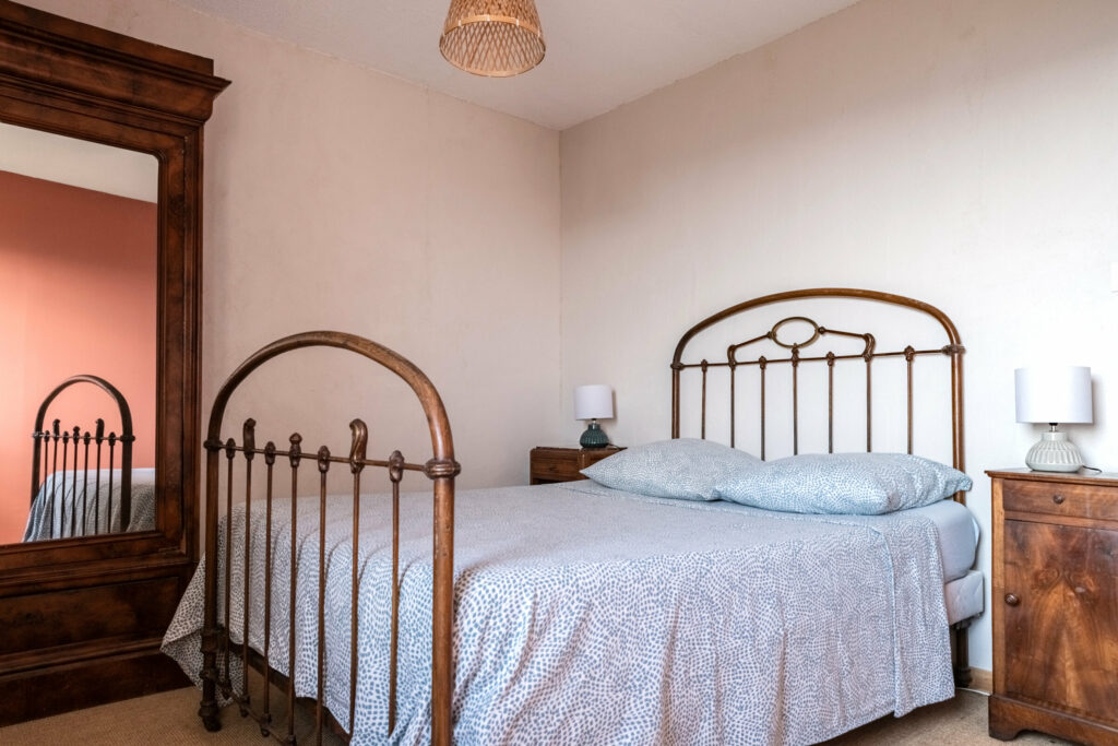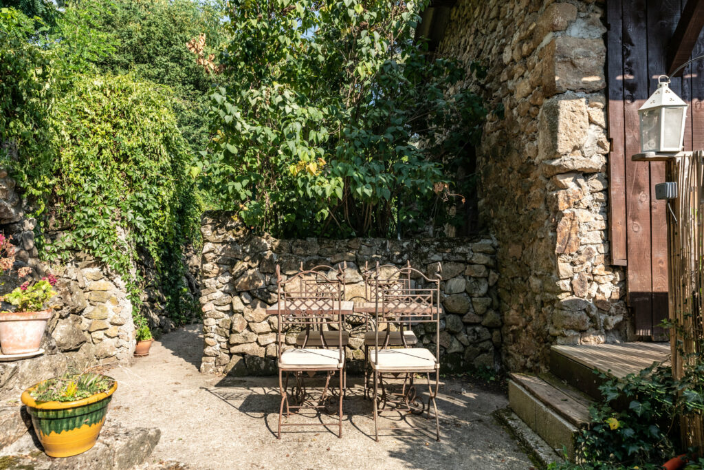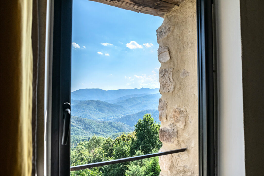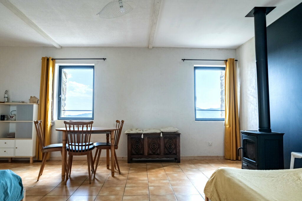 La chambre et la pièce de vie (salon salle à manger) sont exposés sud, avec une vue imprenable sur les monts d’Ardèche. Le gîte fait partie de la maison principale mais a son accès indépendant et sa terrasse privative.