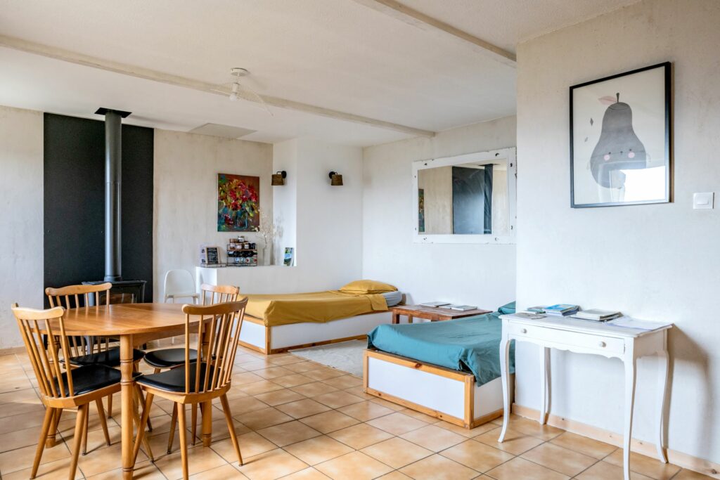 - Un séjour avec un coin nuit composé de deux couchages simples.